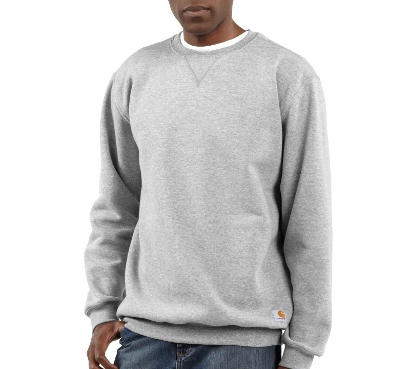 10.5-ounce, 50% cotton/50% polyester blend. Heather Gray fiber content is 70% cotton/30% polyester. Front-neck V patch. Stretchable, spandex-reinforced rib-knit cuffs and waistband. Carhartt label sewn on lower front. Imported.